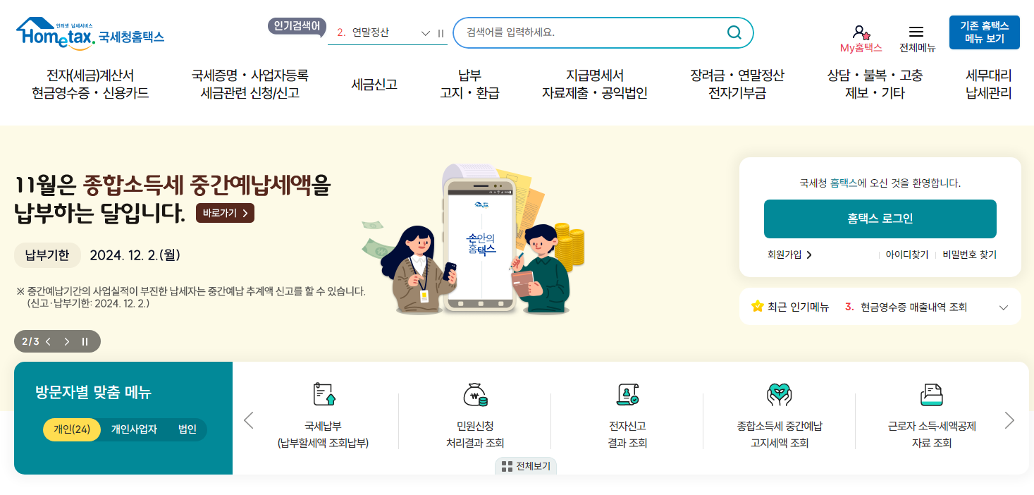 - 홈택스 접속: 국세청 홈택스(www.hometax.go.kr)에 접속합니다.