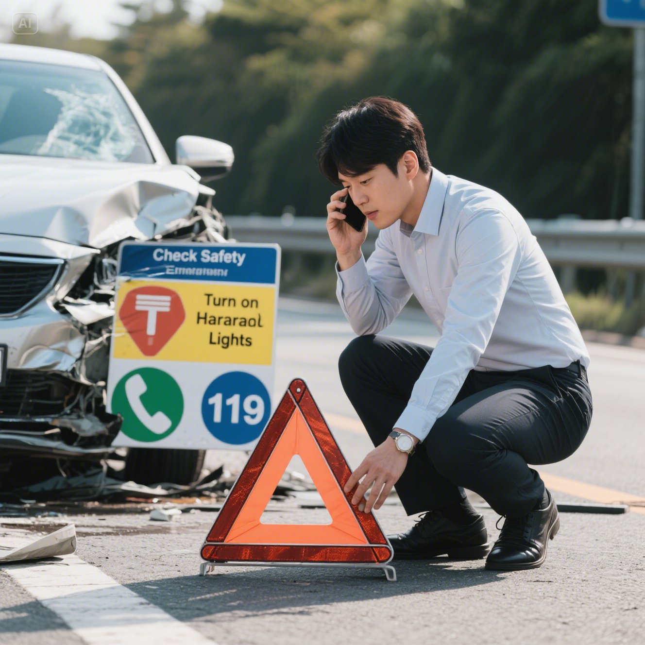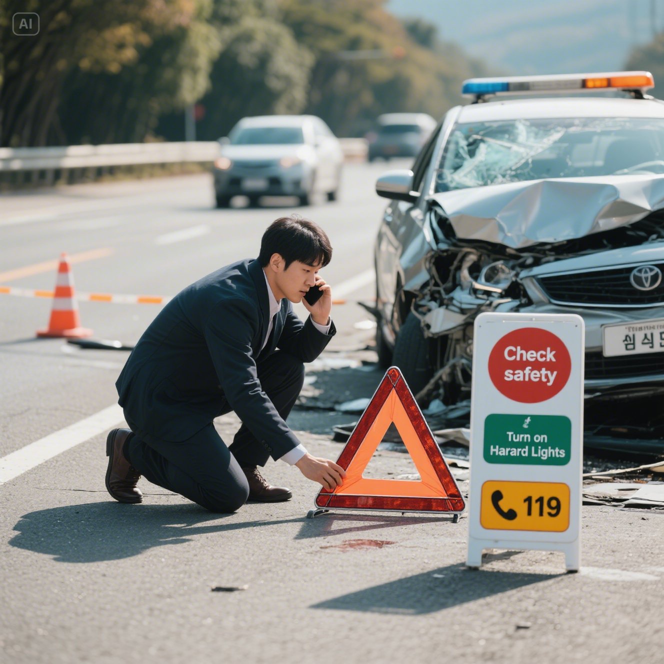 비상등을 켜고 삼각대를 설치한 뒤, 다른 차량들이 사고 현장을 인지할 수 있도록 해주는 게 기본이에요. 만약 밤이라면 손전등이나 스마트폰 불빛을 활용해 시야 확보도 해줘야 해요.